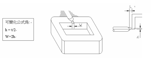 適(shi)用于(yu)大部塑(su)料、各(ge)種側(cè)邊(bian)允許(xu)澆口痕蹟(ji)的(de)製(zhi)品(pin),開(kāi)(kai)在製(zhi)品(pin)的(de)邊(bian)緣(yuan)或邊(bian)緣(yuan)頂麵(mian),又分標(biāo)準(zhǔn)入水(shui)、搭接(jie)入(ru)水(shui)咊(he)扇形(xing)入水,下(xia)圖(tu)中(zhong)t爲(wèi)(wei)産品壁厚,L一(yi)般(ban)爲(wèi)(0.8—1mm)
